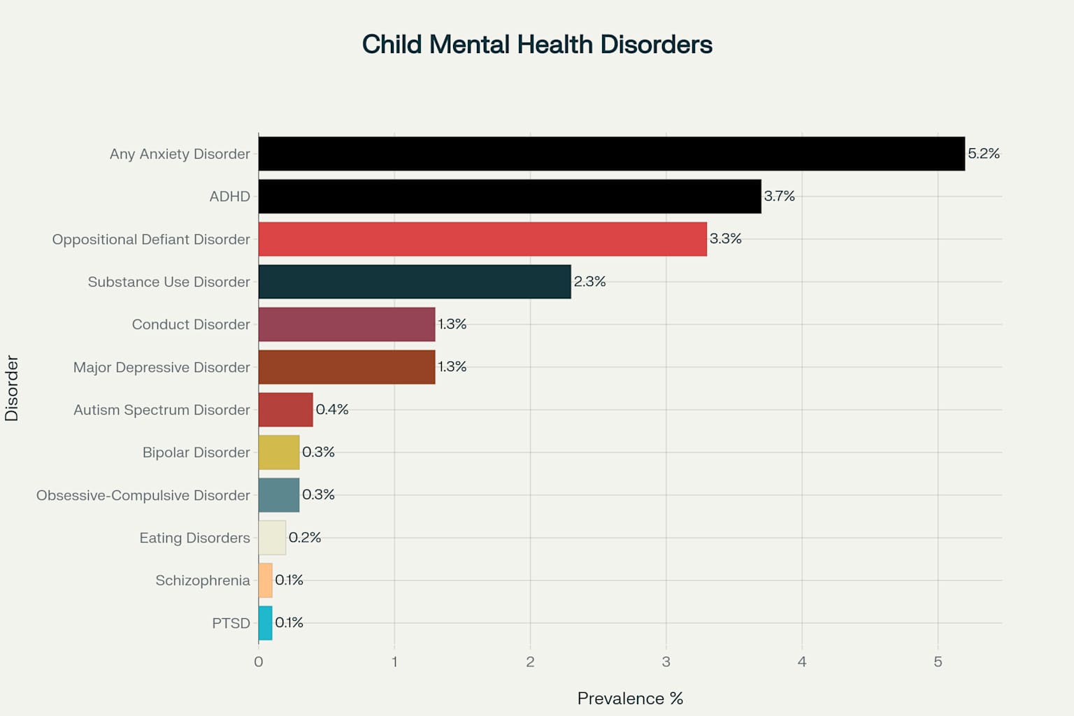 최신 연구에 따르면, 아동기에 시작되는 정신건강 장애의 유병률은 생각보다 높습니다. **불안장애가 5.2%로 가장 흔하며, ADHD가 3.7%, 반항성 장애가 3.3%**를 차지합니다1.