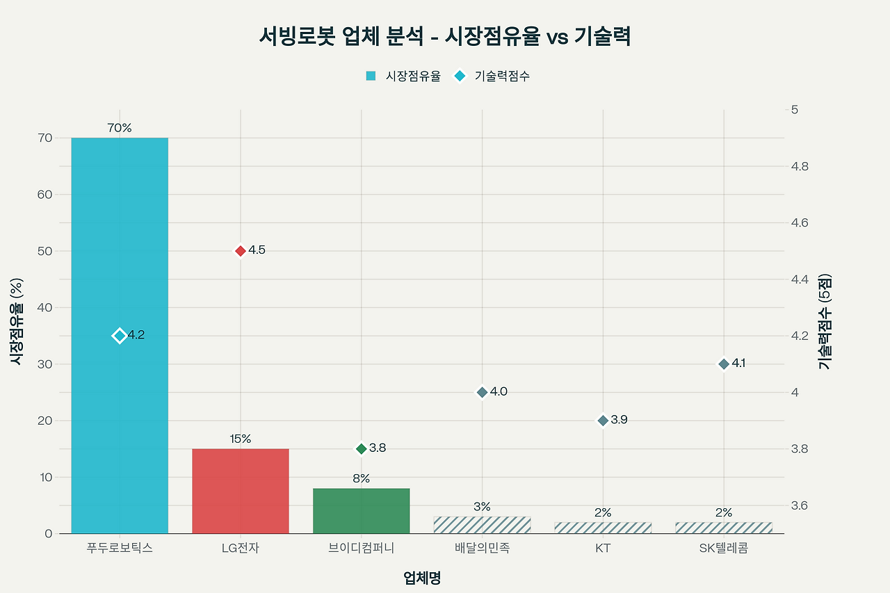 LG전자의 클로이(CLOi) 서브봇은 **기술적 완성도에서 최고 점수(4.5/5점)**를 받았으며, AI 기반 경로 탐색 알고리즘과 다중 트레이 지원 기능이 강점입니다. 특히 엘리베이터 탑승 기능까지 지원하여 층간 배송이 가능한 차별화된 기술력을 보유하고 있습니다.