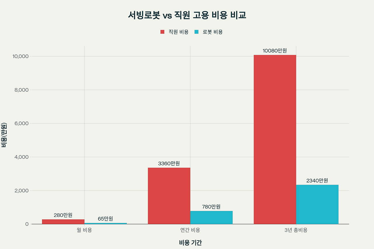 서빙 로봇의 경제성을 구체적으로 분석해보면, 월 렌탈료 65만원으로 직원 1명 월급(280만원) 대비 77% 절감 효과를 보입니다. 3년 총 비용으로 계산하면 직원 고용 시 1억 80만원, 로봇 렌탈 시 2,340만원으로 약 7,740만원의 비용 절감이 가능합니다.