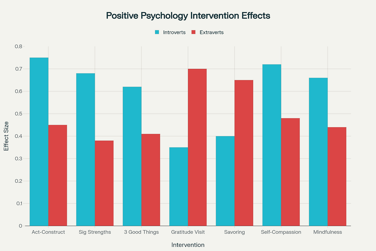 Research on personality-fit in positive psychology interventions reveals striking differences in effectiveness based on temperament. Introverts benefit significantly more from reflective positive psychology practices, while extraverts derive greater benefit from socially expressive interventions.