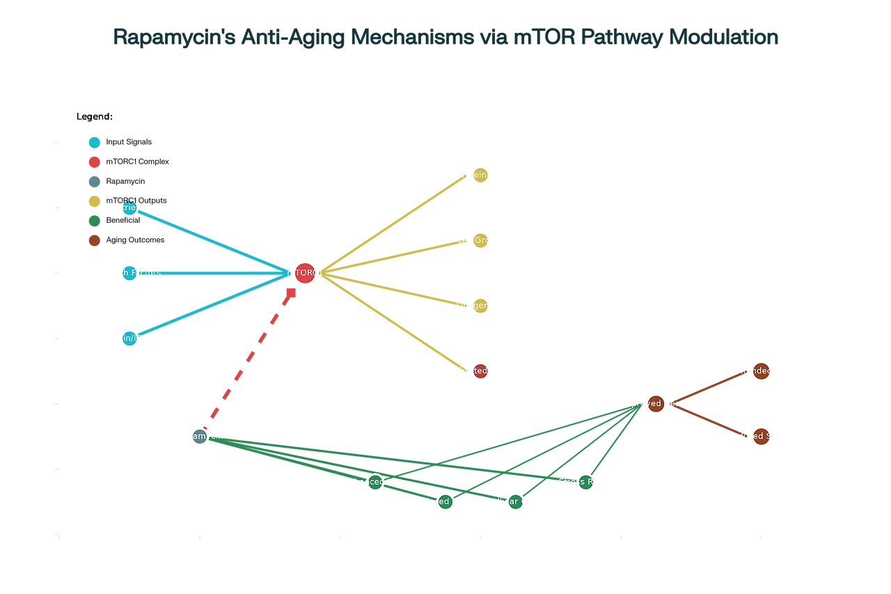 mTORC1 activation promotes anabolic processes including protein synthesis, lipogenesis, and nucleotide synthesis while simultaneously inhibiting catabolic processes such as autophagy. Under conditions of nutrient abundance and growth factor stimulation, elevated mTORC1 activity drives cellular growth and proliferation. However, chronic hyperactivation of this pathway has been implicated in accelerated aging and age-related disease development. Conversely, mTORC1 inhibition shifts cellular resources toward maintenance and repair processes, including enhanced autophagy, stress resistance, and cellular quality control mechanisms.