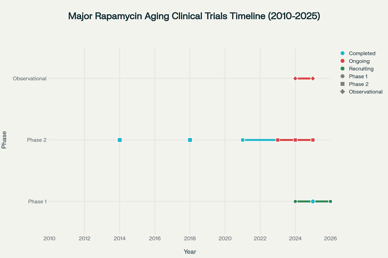 Additional studies are exploring rapamycin's effects on specific age-related conditions. A 2024 clinical trial is investigating once-weekly sirolimus administration combined with exercise training in older adults, focusing on muscle strength and endurance outcomes. Researchers are also studying rapamycin's potential benefits for cognitive function, with early-phase trials examining its effects on mild cognitive impairment and Alzheimer's disease.