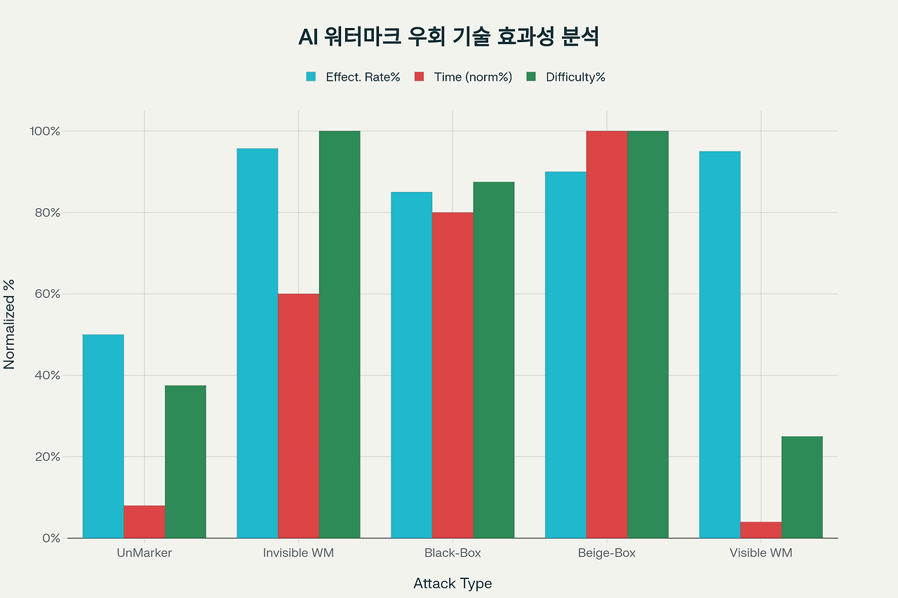 워터마크는 생각보다 취약하다. 학계와 산업계의 최근 연구에 따르면, 워터마크 제거(watermark removal) 기술이 매우 효과적이며 점점 더 정교해지고 있다. 가장 주목할 만한 사례는 캐나다 워터루 대학의 "UnMarker" 도구이다. 이 도구는 워터마킹 알고리즘 지식 없이도 2분 만에 50% 이상의 성공률로 워터마크를 제거할 수 있다.