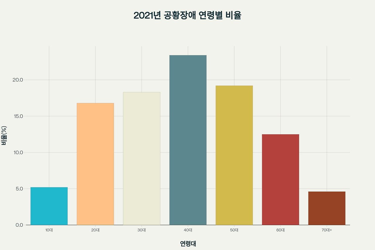 가장 충격적인 사실은 **40대 환자가 전체의 23.4%**로 가장 많다는 점입니다. 이는 우리 사회의 '샌드위치 세대'가 겪는 극심한 스트레스를 보여주는 지표라 할 수 있습니다. 30-50대가 전체 환자의 60% 이상을 차지한다는 것은 공황장애가 더 이상 '연예인만의 병'이 아님을 명확히 보여줍니다.