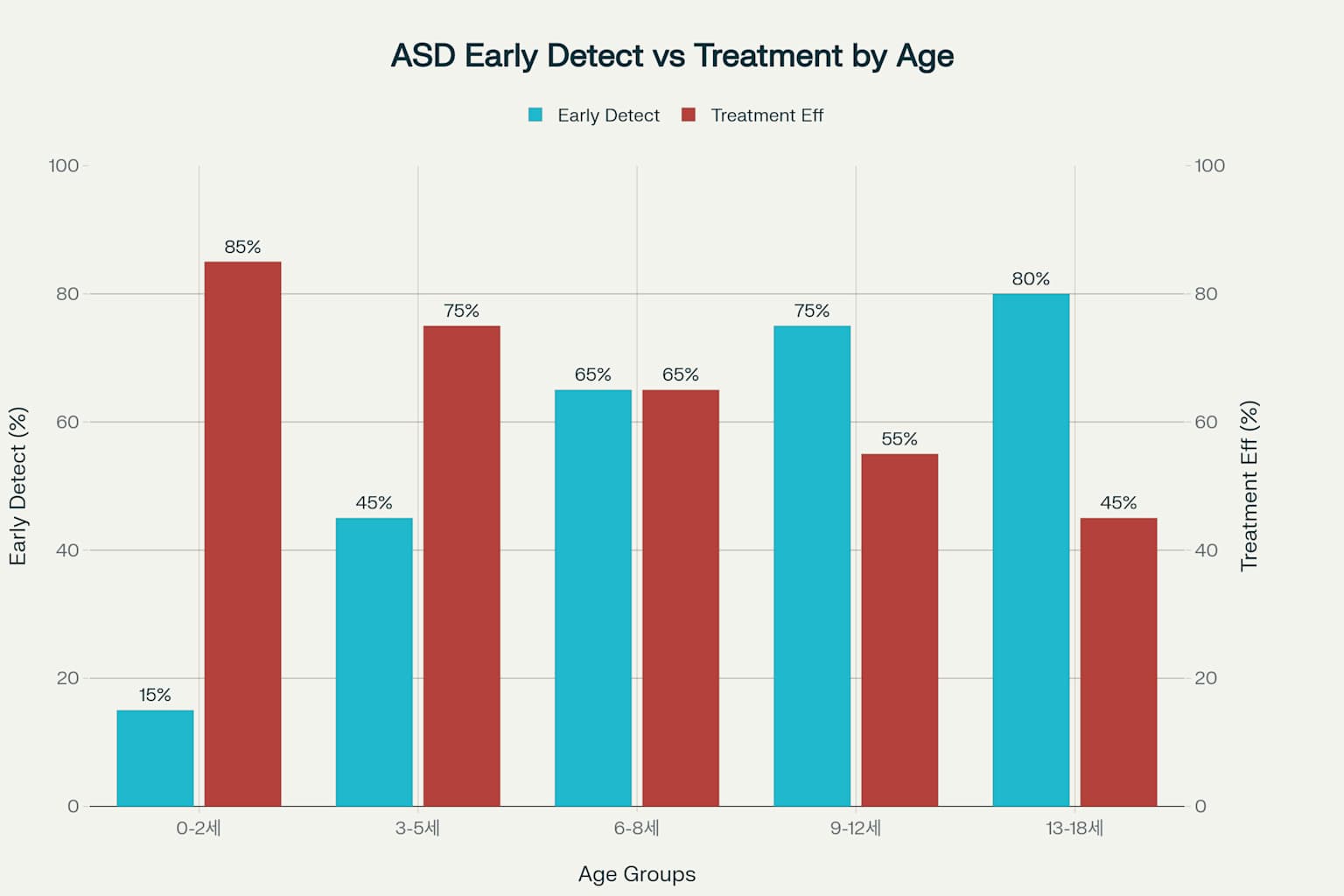 이 데이터는 0-2세 시기의 조기 개입이 얼마나 중요한지를 명확히 보여줍니다. 비록 이 시기의 발견율은 15%에 불과하지만, 치료 효과는 85%에 달해 조기 선별 검사의 필요성을 강조합니다4.