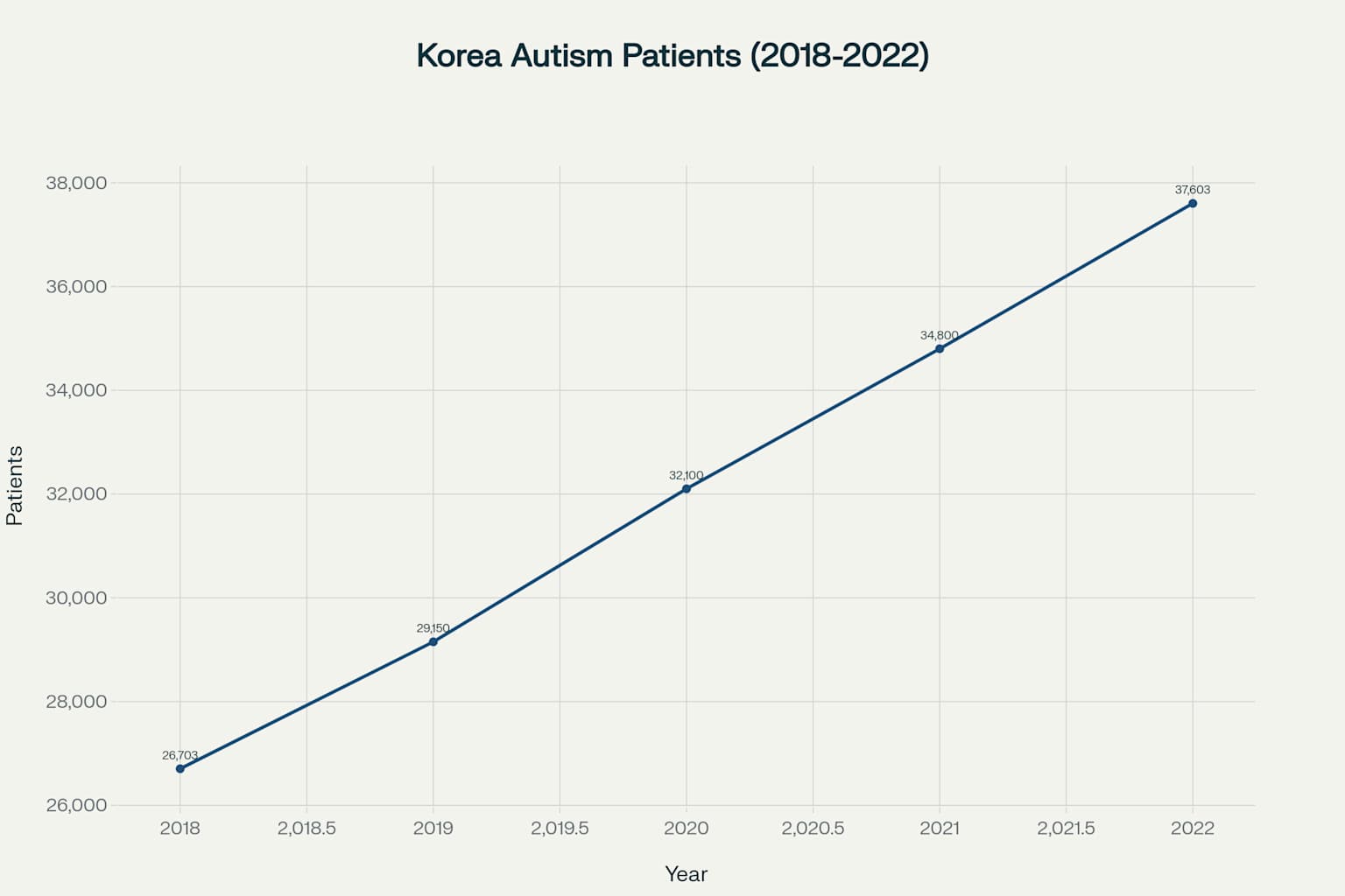 한국의 자폐 스펙트럼 장애 등록환자 수는 최근 5년간 놀라운 증가를 보이고 있습니다. 2018년 26,703명에서 시작하여 2022년 37,603명으로 무려 40.8%나 증가했습니다.