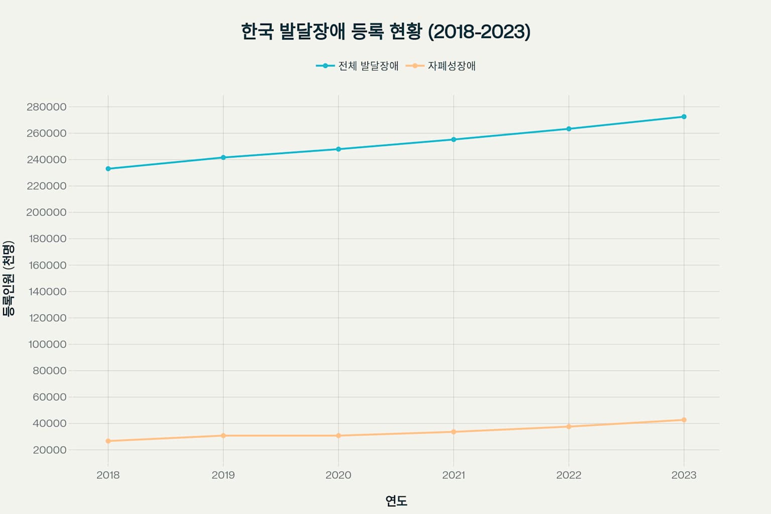 한국의 발달장애인 등록 현황은 매년 급격한 증가를 보이고 있습니다. 특히 자폐성장애의 경우 2018년 26,703명에서 2023년 42,744명으로 무려 60% 이상 증가했습니다4.