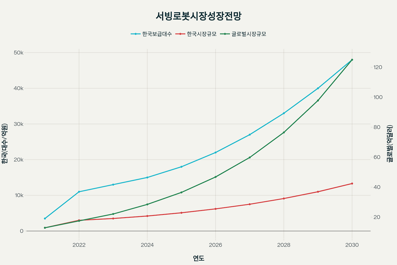 외식업계의 인력난 심화와 인건비 상승이 가속화되면서, 서빙 로봇 식당 도입이 전 세계적으로 급속히 확산되고 있습니다. 특히 2025년 현재, 서빙 로봇은 단순한 자동화 도구를 넘어 외식업체의 생존 전략이자 고객 경험 혁신의 핵심으로 자리잡고 있습니다. 국내외 서빙로봇 시장의 급속한 성장세를 보여주는 비교 차트글로벌 서빙 로봇 시장의 폭발적 성장시장 규모 및 성장 전망글로벌 서빙 로봇 시장은 2024년 28.5억 달러에서 2030년까지 125억 달러로 급성장할 것으로 전망되며, 이는 **연평균 성장률(CAGR) 25.1%**에 해당하는 놀라운 수치입니다. 한국 서빙 로봇 시장 역시 2021년 900억원에서 2024년 4,200억원으로 성장했으며, 2025년에는 5,100억원 규모에 달할 것으로 예상됩니다...