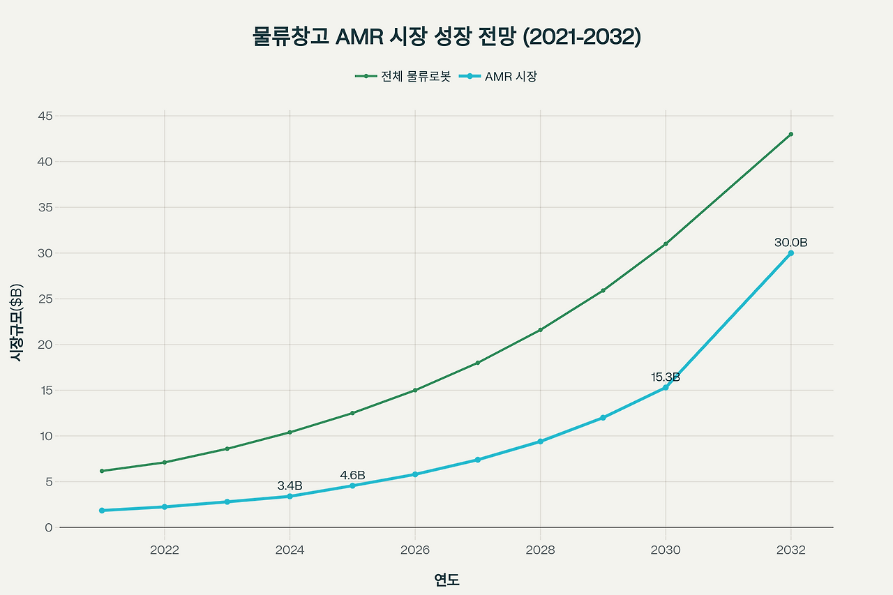 이커머스 시장의 폭발적 성장과 함께 물류 처리량이 기하급수적으로 증가하면서, 물류창고 자율이동로봇(AMR) 도입이 전 세계적으로 급속히 확산되고 있습니다. 특히 2025년 현재, AMR은 단순한 운송 도구를 넘어 스마트 물류센터의 핵심 인프라로 자리잡고 있으며, 기업들의 경쟁력 확보와 비용 효율성 제고에 필수적인 요소가 되었습니다. 물류창고 AMR 시장의 급속한 성장 전망을 보여주는 차트글로벌 AMR 시장의 폭발적 성장시장 규모 및 성장 전망글로벌 AMR 시장은 2024년 28억 달러에서 2030년 456억 달러로 성장할 것으로 예상되며, 이는 **연평균 성장률(CAGR) 15.1%**에 해당하는 놀라운 수치입니다. 더 광범위한 물류 로봇 시장 전체로 보면, 2021년 61억 7천만 달러에서 2029년 ..